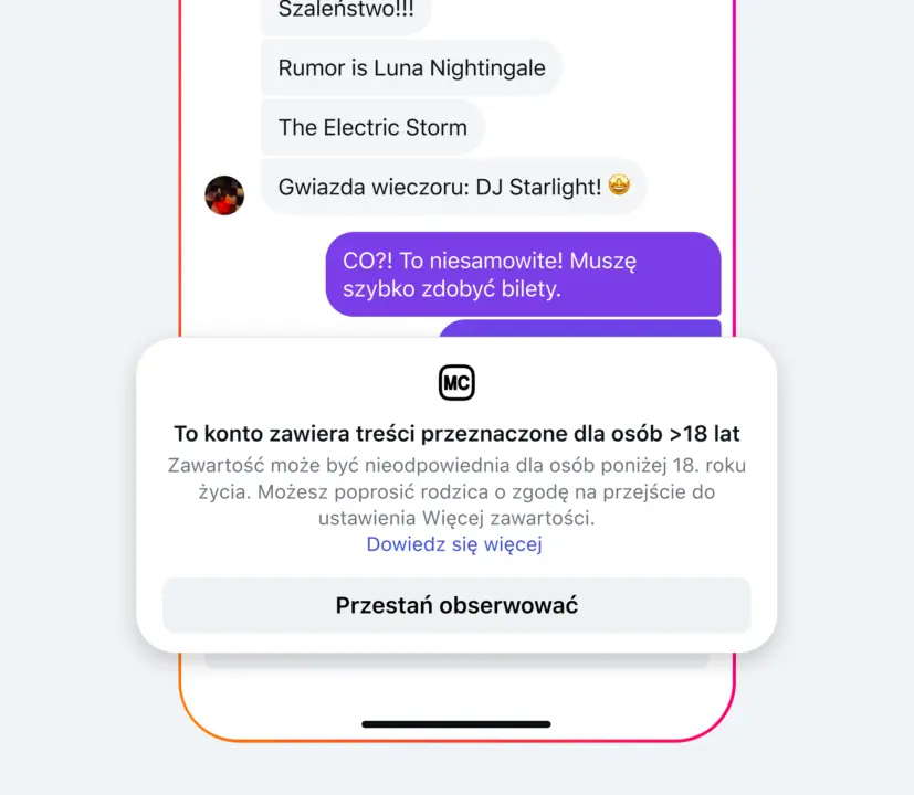 Meta rozszerzyła też mechanizmy, które aktywnie blokują nastolatków przed kontaktami z kontami uznanymi za nieodpowiednie. Jeśli Instagram wykryje konto, które często publikuje treści sprzeczne z zasadami wiekowymi np. materiały zawierające groźne zachowania, narkotyki, drastyczne treści lub treści seksualne, nastolatek nie będzie mógł śledzić takiego konta ani wchodzić z nim w żadne interakcje.