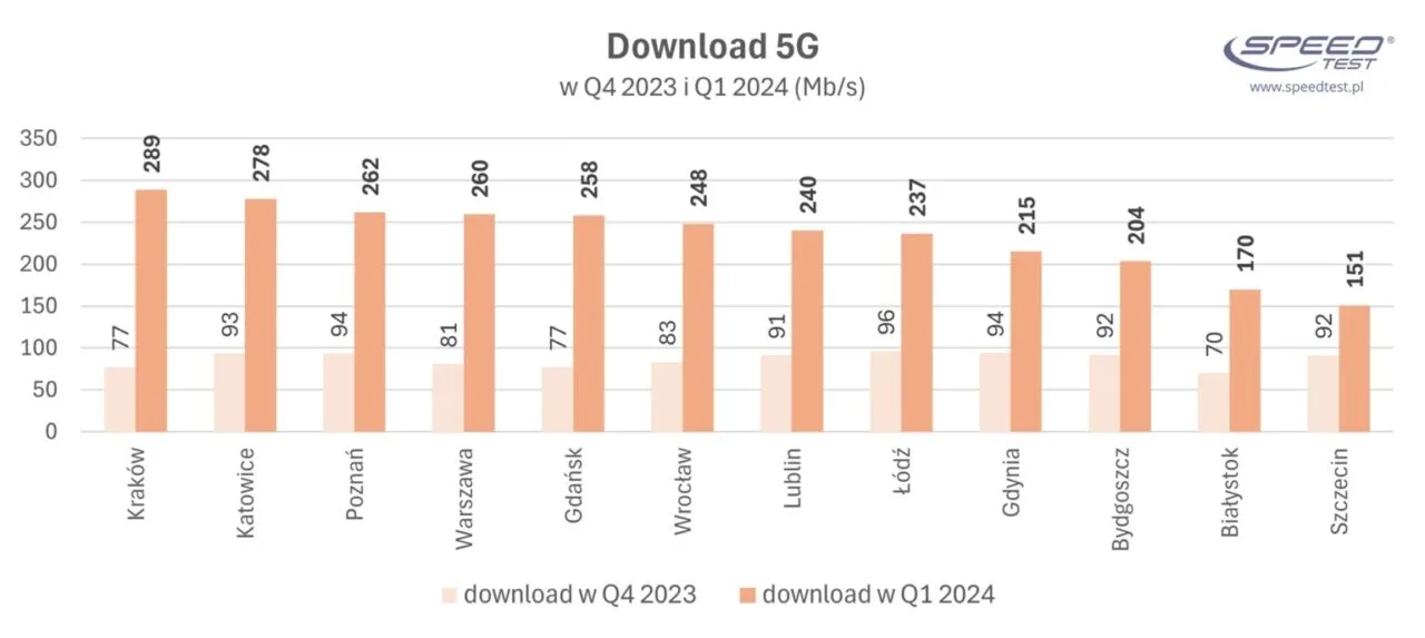 Podobny rezultat uzyskały Katowice (278 Mb/s) oraz Poznań (262 Mb/s), Warszawa (260 Mb/s) czy Gdańsk (258 Mb/s). Obecność tych miejscowości na najwyższych miejscach była raczej oczekiwana – to właśnie tam powstaje najwięcej stacji. Nieustannie jednak trwa rozwój niezbędnej infrastruktury w innych regionach kraju. Idealnymi przykładami są Białystok (170 Mb/s) i Szczecin (151 Mb/s).