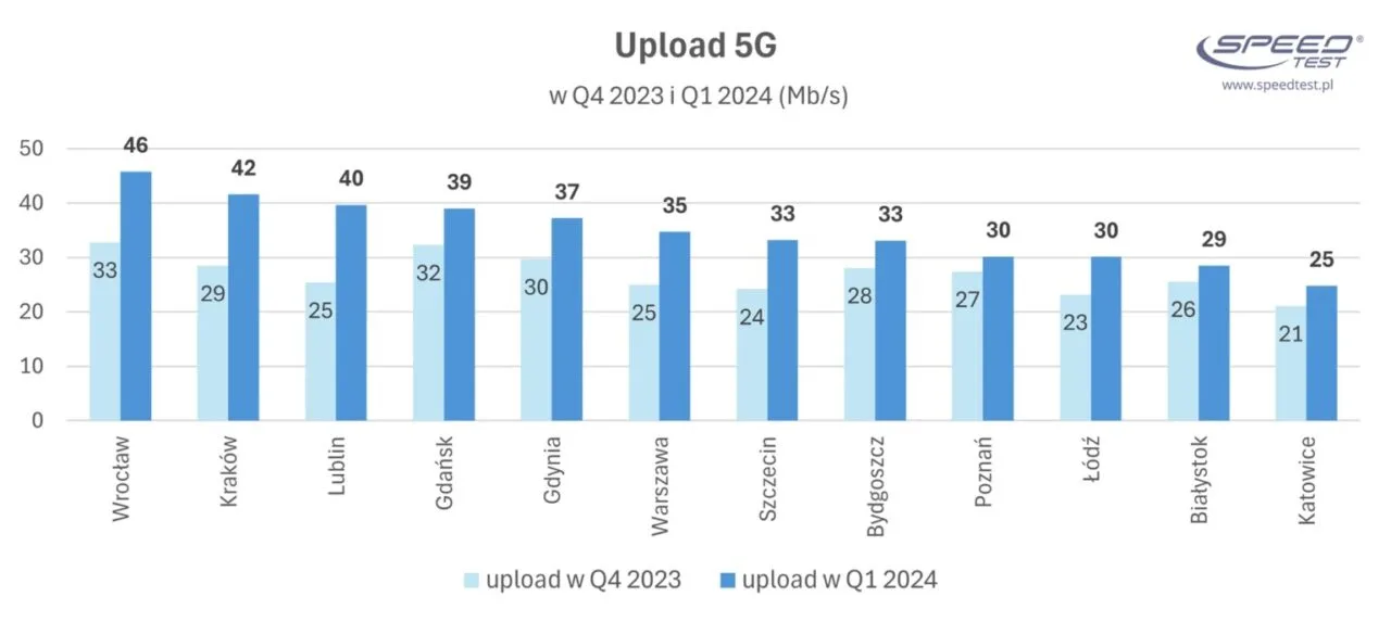 Jeśli zaś chodzi o upload, to ten wskaźnik także rośnie w przypadku 5G. Na terenie wybranych miast (Wrocław, Kraków, Lublin) dostrzeżono przyrosty prędkości pobierania wynoszące nawet 50% w stosunku do poprzedniego kwartału. Robi wrażenie, prawda?