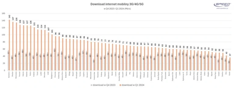 Wciąż jednak nie możemy mówić o pełnej powszechności 5G, dlatego warto też zerknąć w stronę zbiorczego rankingu dla 3G/4G/5G. Tutaj zwycięzcą okazują się być Katowice (142 Mb/s), natomiast drugie miejsce należy do Olsztyna (137 Mb/s). Podium z kolei zamyka Warszawa z wynikiem 135 Mb/s. Zerknięcie na procent kwartalnego przyrostu daje jasny obraz na to, jaki ogromny wpływ ma rozwijająca się najnowsza technologia. Rezultaty są bowiem 2-3 razy wyższe w porównaniu z końcówką 2023 roku.