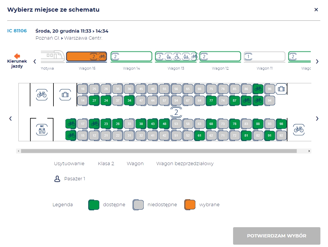 Jeśli odwiedzicie stronę internetową przewoźnika lub aplikację mobilną, to za każdym razem ujrzycie możliwość wybrania miejsca ze schematu. Dzięki temu wskażecie konkretne miejsce w wagonie lub po prostu sprawdzicie frekwencję. To znaczące ułatwienie – zwłaszcza jeśli zależy nam na kolejnej miejscówce lub podróżujemy grupą. Wtedy wspólny zakup biletów jest znacznie przyjemniejszy i bardziej intuicyjny.