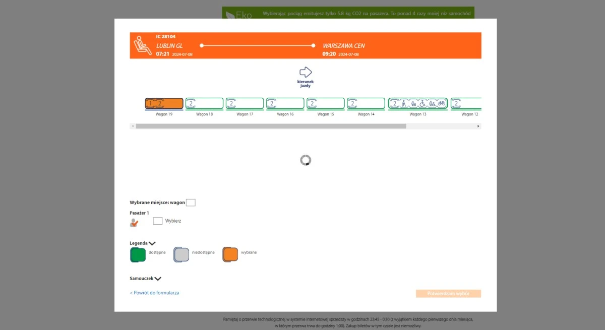 Uf, na szczęście w systemie e-IC 2.0 system wyboru miejsc ze schematu działał. Występował w jego przypadku ten sam błąd zawartością wspomnianego wagonu pierwszej klasy, ale przynajmniej pozwalał on wybrać miejsce w innym wagonie, a potem dokonać zakupu biletu.