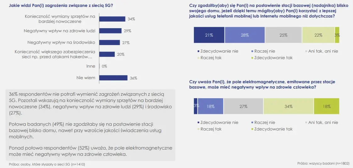 Jeśli chodzi o zagrożenia związane z siecią 5G, to 36% respondentów nie ma wiedzy na ich temat lub nie potrafi ich wymienić. Dalej mamy do czynienia z 34% osób, które widzą przeszkodę przede wszystkim w konieczności wymiany sprzętów na bardziej nowoczesne. Kolejne dwa miejsca (29 i 27%) zajmują odpowiedzi wskazujące na negatywny wpływ na zdrowie oraz środowisko naturalne. Te spiskowe teorie i fake newsy wciąż mają się niestety bardzo dobrze wśród internautów.
