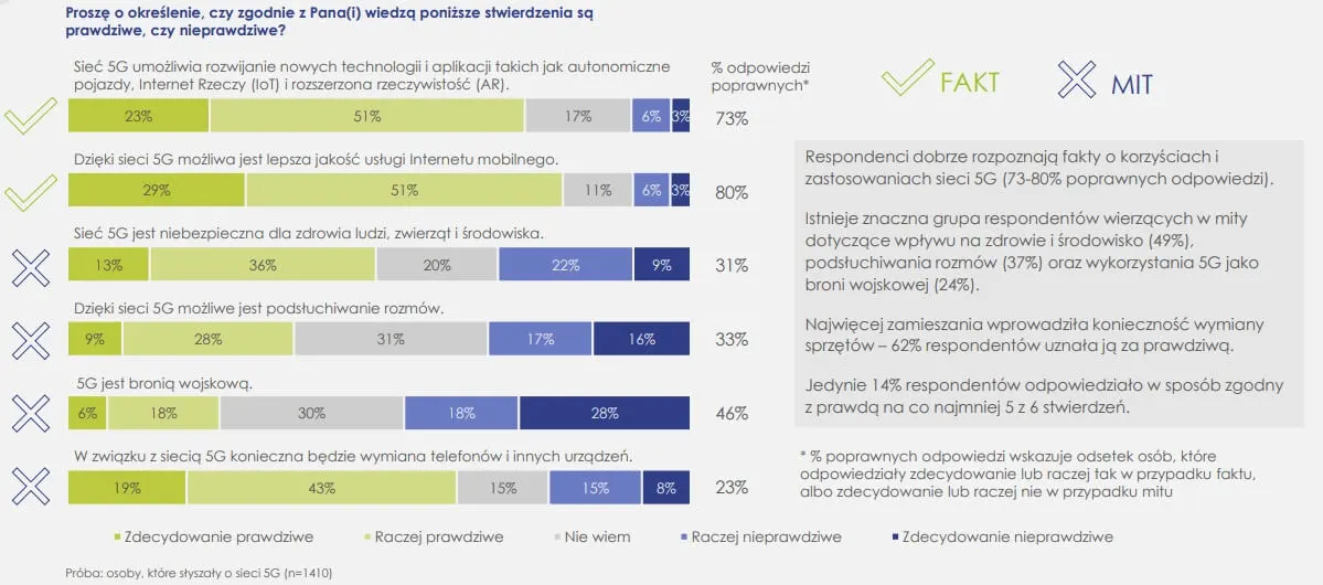 UKE postanowiło także zbadać wiedzę odnośnie do faktów i mitów 5G – tutaj wyniki są dosyć mieszane. Dobre strony sieci rozpoznało aż 80% internautów, mowa tu o możliwości rozwijania nowych technologii czy dostarczania lepszej jakości usług. Mimo to wciąż sporo osób wierzy w fałsz, bowiem aż 49% osób jest przekonana o szkodliwym wpływie na zdrowie i środowisko. Oprócz tego 37% ludzi twierdzi, że technologia służy do podsłuchiwania społeczeństwa, 24% natomiast uważa ją za broń wojskową.