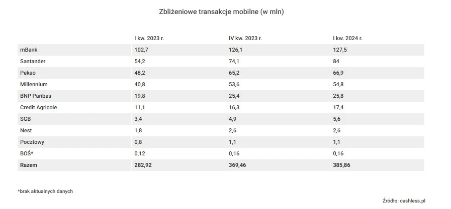 Jeśli zaś chodzi o lidera bankowości mobilnej, to tutaj bez zmian króluje mBank zamykający kwartał z 127 milionami transakcji – nie zanotowano jednak ogromnego wzrostu. Kolejne miejsce w rankingu zajmują Santander, Pekao oraz Millenium. Wszystkie te banki poradziły sobie lepiej niż w poprzednich kwartałach. Mamy więc do czynienia z ogólnym trendem, co zapewne podoba się zwolennikom mobilnych płatności zbliżeniowych. Problemem jest jednak brak podawania konkretnych statystyk przez poszczególne placówki. Zbieranie danych nie należy przez to do najłatwiejszych zadań.