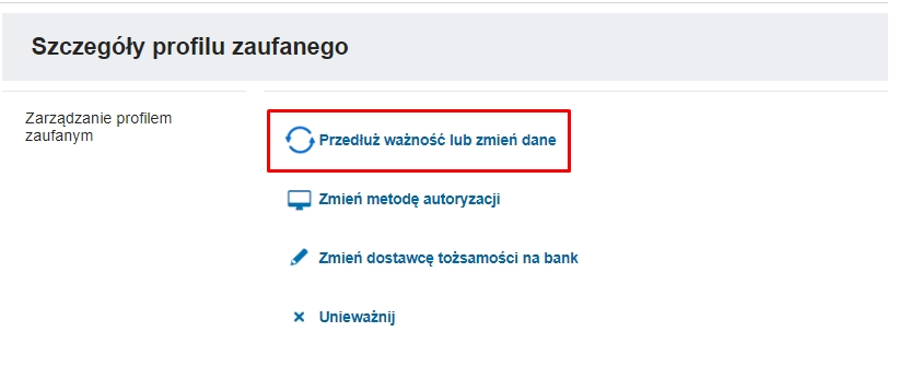 Jeśli więc w polu „Sposób utworzenia/przedłużenia” widzisz informację o treści „Profil zaufany przedłużony automatycznie na czas pandemii”, to koniecznie wykonaj poniższe kroki: