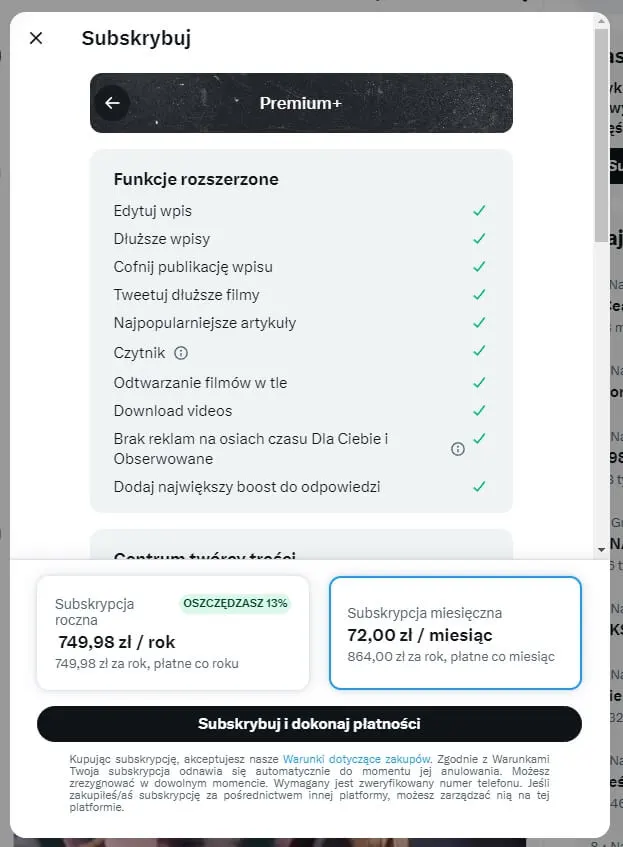 Okej, co więc z nowościami? Premium Plus kosztuje 72 zł miesięcznie (749,98 zł rocznie) i oferuje nieco więcej, niż powyżej opisany abonament. Mowa przede wszystkim o całkowitej likwidacji reklam na osiach czasu „Dla Ciebie” i „Obserwowane”. Osoby decydujące się na tak wysoką opłatę mogą być więc pewne, że podczas przeglądania postów nie natkną się na jakiekolwiek przeszkadzające elementy. Subskrybenci otrzymają ponadto „największy boost do odpowiedzi”, co nie zostało dokładnie wyjaśnione.
