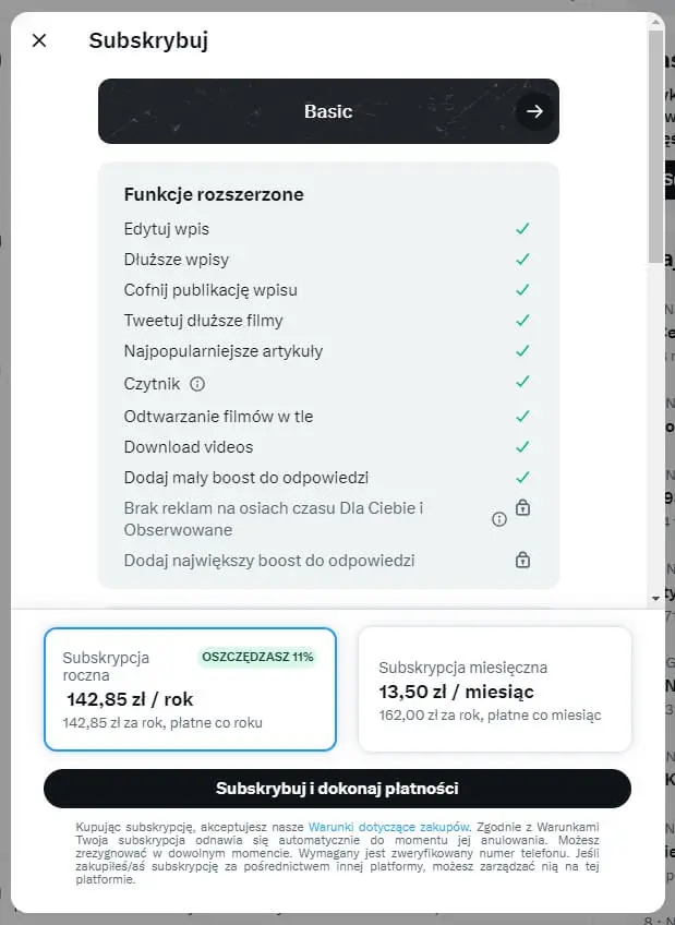 Internauci chcący skorzystać z dodatkowych funkcji, ale niemający zamiaru wydawać zbyt wielu złotówek, mogą wybrać plan Basic. Wyceniono go na 13,50 zł miesięcznie (142,85 zł rocznie) i oferuje on większość rozwiązań znajdujących się za paywallem. Nie ma jednak mowy o pozbyciu/ograniczeniu reklam oraz dostępie do centrum twórcy treści. Oznacza to, że zarabianie na publikacji wpisów jest niemożliwe. Nie zobaczycie także znaczka weryfikacji przy nicku oraz nie zweryfikujecie się za pomocą dowodu tożsamości. Boost do odpowiedzi będzie natomiast „mały”. Mówimy więc o wariancie dla zwykłych konsumentów niemających ogromnych inspiracji do zostania medialnymi influencerami.