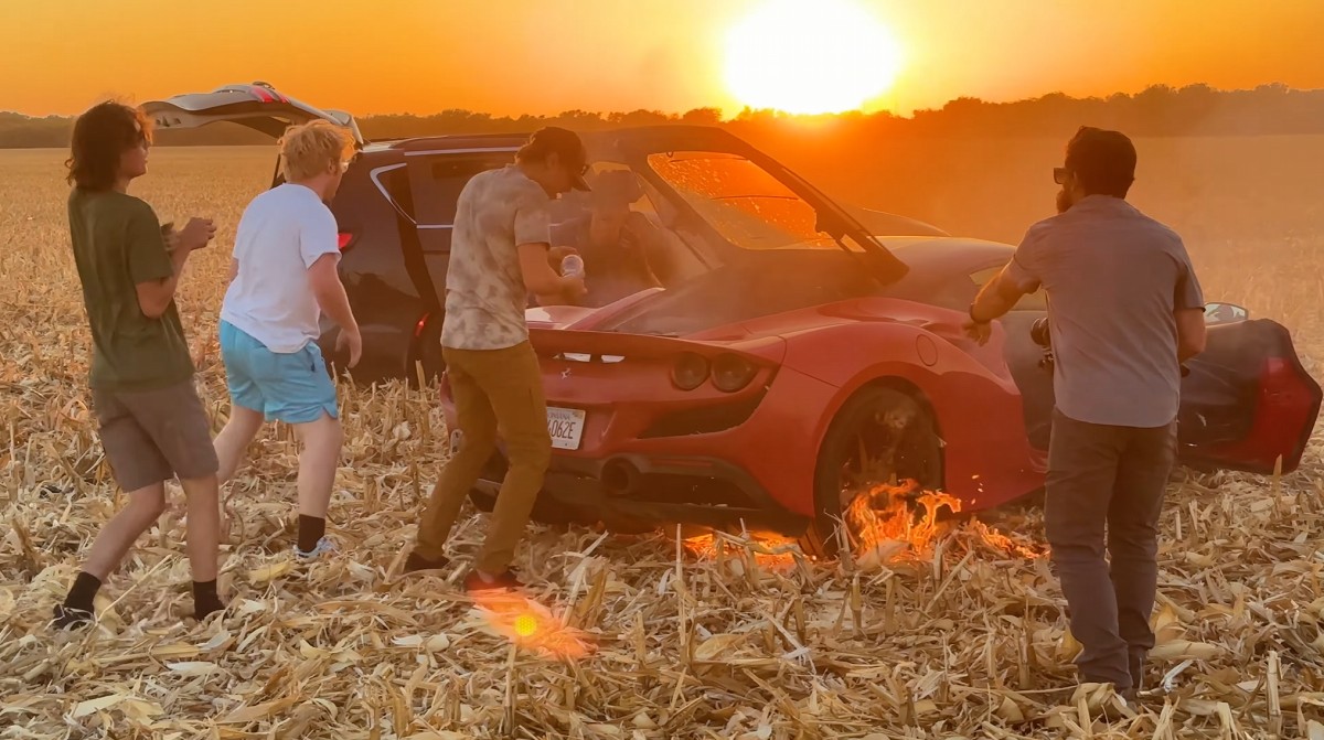 Popularny YouTuber obrócił swoje Ferrari F8 w popiół, upalając je wcześniej (ha, ha) na polu kukurydzy. Prawdopodobnie powinien poruszać się po nim traktorem marki Lamborghini – być może wtedy nie stało by się nic złego.