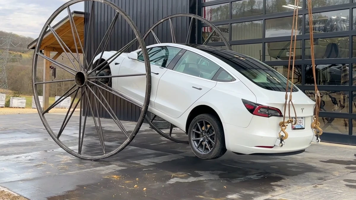 Założył do Tesli 120-calowe koła jak z dorożki. Odwrócił ją dachem do dołu