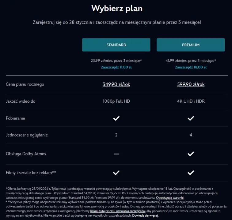 Wariant standardowy umożliwia oglądanie treści w jakości Full HD jednocześnie na dwóch urządzeniach. Z kolei plan Premium oferuje rozdzielczość 4K z HDR oraz obsługę nawet czterech ekranów w tym samym czasie, dodatkowo z dźwiękiem Dolby Atmos. Niezależnie od wybranego pakietu użytkownicy mogą pobierać filmy i seriale do oglądania offline. Nie muszą również oglądać reklam, chociaż serwis zaznacza, że w przypadku transmisji na żywo oraz wydarzeń specjalnych mogą pojawić się pewne materiały promocyjne.