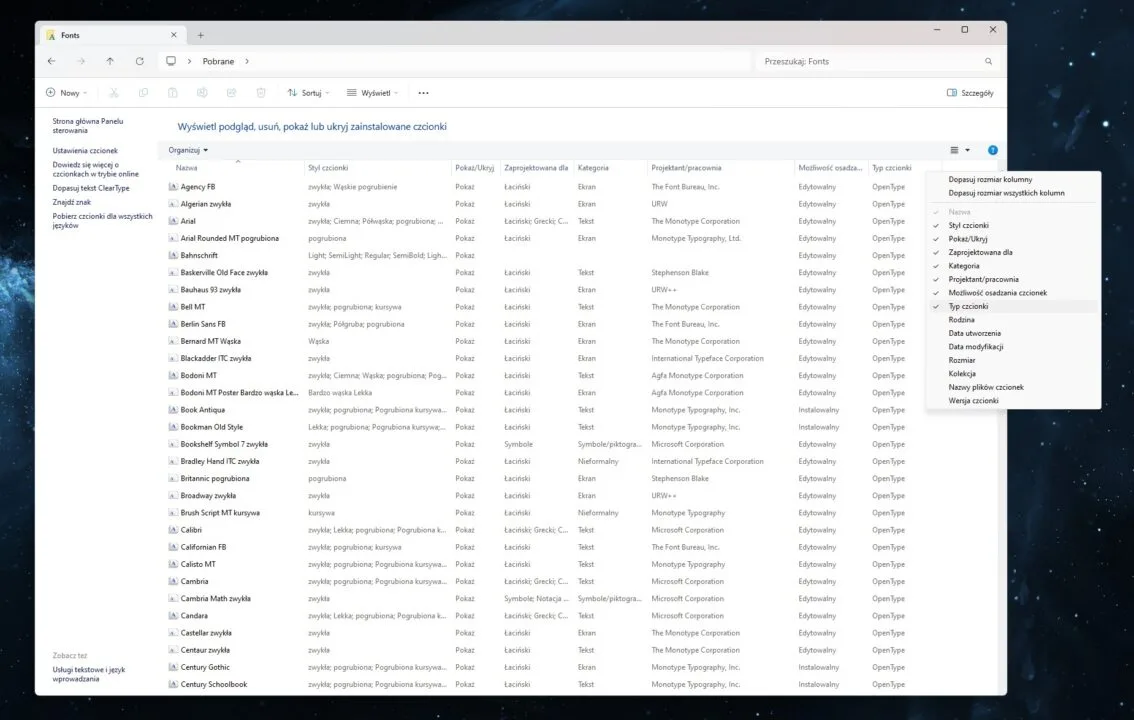 Stare czcionki można usunąć poprzez menu ustawień tychże. Znajdziecie je w menu Ustawienia, przechodząc do zakładki Personalizacja i Czcionki. Problem polega na tym, że trzeba klikać na nie indywidualnie, aby wyświetlać szczegóły na ich temat i zidentyfikować te, które utracą wsparcie. Łatwiej będzie przejść do katalogu C:\Windows\Fonts i najpierw zmienić Widok na Szczegóły, a później kliknąć prawym przyciskiem myszy na którąkolwiek kategorię i zaznaczyć Typ czcionki. W odpowiedniej kolumnie znajdziecie wtedy informacje, które Was interesują.
