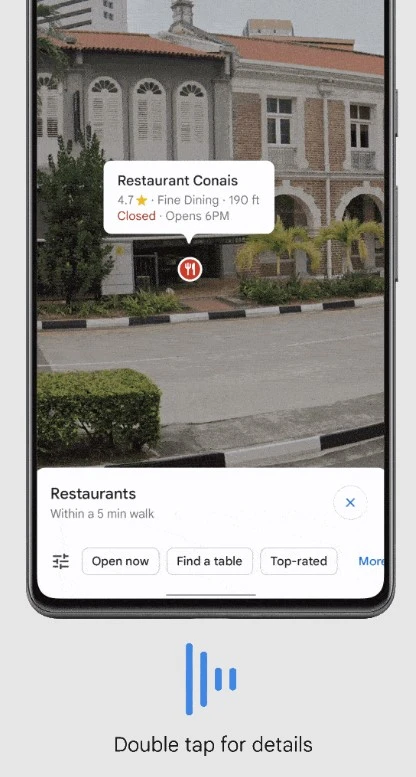 Nie zabraknie również kolejnej opcji obejmującej integrację aplikacji Mapy Google oraz Obiektyw Google. Wkrótce znacznie łatwiej będzie eksplorować okolicę, zwłaszcza osobom niedowidzącym i niewidomym. Ulepszony czytnik ekranu skuteczniej zidentyfikuje ważne miejsca w postaci bankomatów, restauracji czy przystanków autobusowych. Wystarczy skierować aparat smartfona na okolicę i funkcja TalkBack na głos odczyta informacje dotyczące tego, czy niedaleko znajduje się poszukiwany obiekt. Oprócz tego usłyszymy godziny otwarcia, oceny pozostawione przez konsumentów i wskazówki dojazdu.