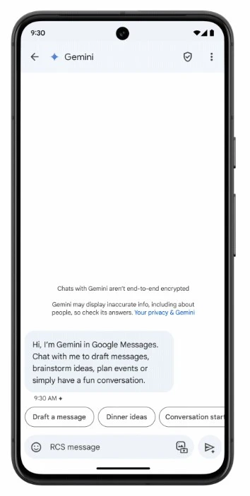 Ostatnią zaprezentowaną nowością jest możliwość wykorzystania Gemini w aplikacji Wiadomości. Mowa tak naprawdę o wbudowanym asystencie AI, którego możemy wykorzystać do konstruowania szkiców wiadomości, planowania wydarzeń itd.