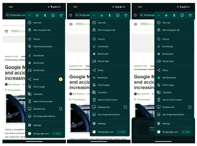 Teraz wystarczy dotknąć ikonę z trzema kropkami w prawym górnym rogu ekranu i nacisnąć ikonę gwiazdki. Mamy więc do czynienia z intuicyjnym rozwiązaniem, którego teoretycznie nie da się bardziej ułatwić. Google najwidoczniej chce się podjąć tego wyzwania, co możecie zobaczyć na poniższych zrzutach ekranu. Dostrzegacie jakąkolwiek zmianę?