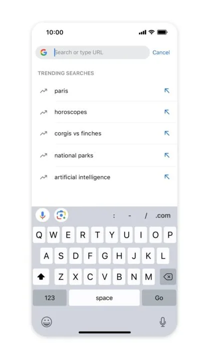 Tym razem wyłącznie coś dla użytkowników systemu iOS. Nareszcie otrzymają oni sekcję sugestii biorących pod uwagę trendy wyszukiwania. Jak możecie zobaczyć na poniższym zrzucie ekranu, Google wyświetli najpopularniejsze frazy wpisywane przez innych internautów.