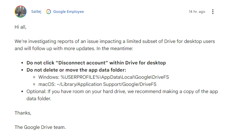 Pokrzywdzonych osób jest naprawdę sporo i Google zaleca, by do momentu rozwiązania problemu nie wprowadzać jakichkolwiek zmian w folderze głównym oraz już istniejących danych. Nie należy też klikać przycisku „Rozłącz konto” na desktopowej wersji usługi oraz usuwać folderów widocznych na powyższym zrzucie ekranu. Sprawa jest bowiem o tyle poważna, iż fora pomocy technicznej są w głównej mierze obsługiwane przez wolontariuszy, którzy nie mają pełnego wglądu w usługę. Interwencja musi nadejść więc z samej góry.