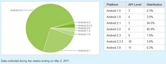 Froyo można znaleźć na 65,9% wszystkich zarejestrowanych urządzeń z Androidem. To o prawie 2% więcej niż przed miesiącem. Dlaczego jego popularność rośnie, mimo tego, że na rynku jest dostępna już nowsza wersja na smartfony – 2.3 Gignerbread (która ma ledwie 1% udziału w rynku) i zupełnie nowa – 3.0 Honeycomb (ledwie 0,3%) – na tablety?