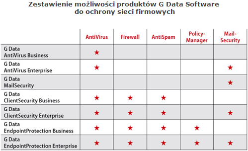 Nowość jaką jest moduł PolicyManager gwarantuje dochowanie reguł bezpieczeństwa w nierzadko prywatnym korzystaniu z firmowej sieci komputerowej. Daje administratorom firmowych sieci możliwość sankcjonowania indywidualnego korzystania z przenośnych urządzeń, nośników pamięci USB, gier, popularnych aplikacji czy też niekontrolowanego surfowania w Internecie w czasie pracy. G Data EndpointProtection Business łączy w sobie cechy antywirusa sieciowego i zdalnie zarządzanego firewalla podnosząc jednocześnie wydajności pracy w przedsiębiorstwie. G Data EndpointProtection Enterprise poszerza wersję Business o bardzo wydajny moduł ochrony poczty G Data MailSecurity. Rozwiązanie bram pocztowych – niezależne od oprogramowania serwera poczty – filtruje ruch wiadomości przychodzących i wychodzących (SMTP/ POP3) na obecność wirusów lub spamu.
