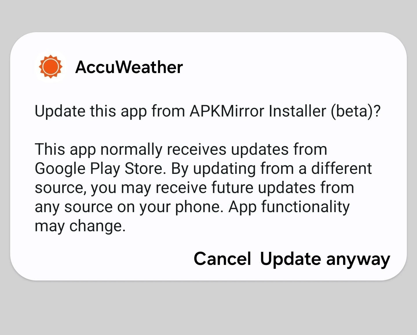 Redakcja portalu Android Police otrzymała kilka interesujących zgłoszeń od swoich czytelników. Poniżej możecie zobaczyć wyżej opisane powiadomienie na telefonie Samsung Galaxy S23 Ultra podczas instalowania aplikacji AccuWeather spoza oficjalnego Sklepu Play. Podobna sytuacja spotkała innego konsumenta, który próbował pobrać Adobe Lightroom za pośrednictwem Galaxy Store, czyli usługi wbudowanej w smartfony od koreańskiego producenta. Mamy więc do czynienia z dosyć wymownym znakiem, że notyfikacja początkowo obecna na Pixelach planuje zagościć także na innych urządzeniach.