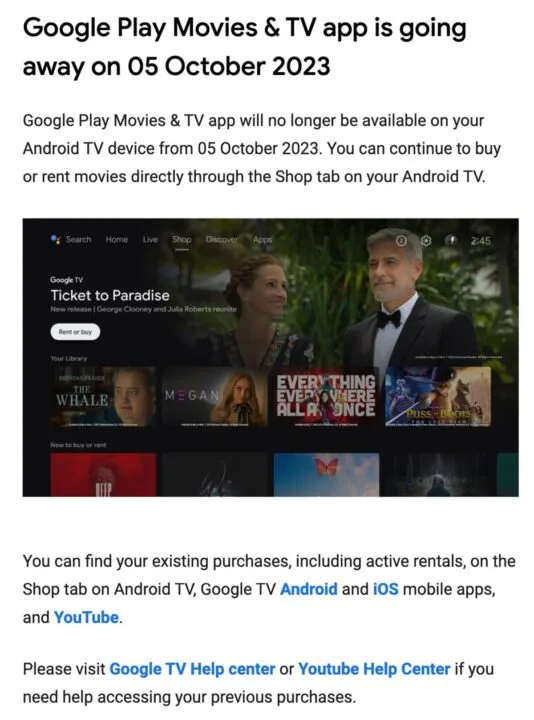 Usługa Filmy i TV Google Play została uruchomiona w 2011 roku. Miała umożliwiać wypożyczanie lub kupowanie filmów i programów telewizyjnych oraz dodawanie ich do swojej biblioteki. Usługa ta od lat cieszyła się umiarkowaną popularnością, a za jej sporą zaletę postrzegano synchronizację zakupów z innymi produktami Google, takimi jak YouTube. W ostatnim czasie widniała wyłącznie na Android TV. Google rezygnuje ze znanej aplikacji głównie dlatego, aby nie duplikować pewnych funkcji.