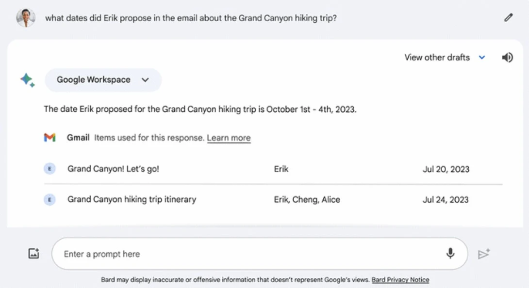 Powodem, dla którego zaczynamy od tego eksperymentu jest przede wszystkim to, że jest to pierwszy raz, kiedy model językowy językowy faktycznie integruje się z danymi osobowymi użytkownika. Chcemy się upewnić, że robimy to dobrze. Planujemy rozszerzyć integrację Bard na więcej produktów od Google, a także na partnerów spoza Google.
