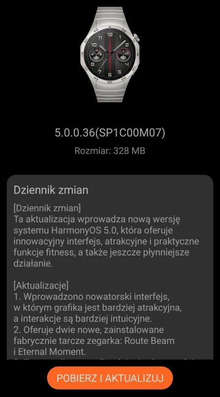 W przypadku smartwatchy z serii Huawei Watch GT 4 aktualizacja do HarmonyOS 5.0.0.0.36 (SP1C00M07) jest nieco większa niż w serii GT 5. Patch ma rozmiar ok. 328 MB i nic dziwnego, bowiem nowe wydanie systemu operacyjnego przynosi całą masę usprawnień. Jako pierwsi otrzymali ją mieszkańcy Indii i Rumunii.