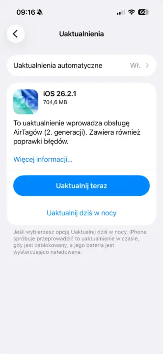 iOS 26.2.1 to również szereg poprawek błędów i systemów zabezpieczeń. Apple jednak nie zdradza szczegółów, więc trudno mówić o konkretach. Jeśli zaś chodzi o rozmiar aktualizacji – wszystko tak naprawdę zależy od modelu urządzenia. W przypadku mojego iPhone’a 16 musiałem pobrać nieco ponad 700 MB.