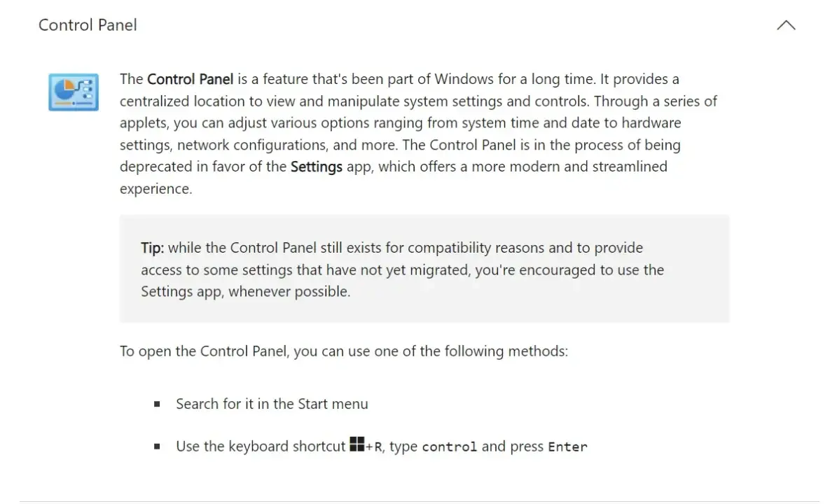 Wzmianka o rezygnacji z Panelu sterowania pojawiła się na stronach wsparcia technicznego, w sekcji poświęconej narzędziom do konfiguracji systemu. W zakładce dedykowanej panelowi sterowania czytamy, że „Panel sterowania jest obecnie w trakcie procesu wygaszania na rzecz aplikacji Ustawienia, oferującej nowocześniejszy wygląd i przyjaźniejszą obsługę”.