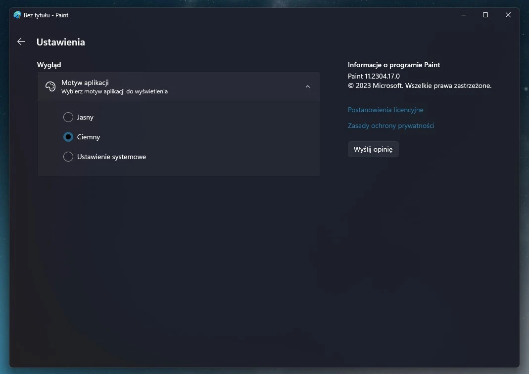 Tryb ciemny w aplikacji Paint dostosuje się do trybu działania Windows 11. Chcesz wymusić tryb ciemny lub go wyłączyć? Zrobisz to z poziomu nowego menu ustawień omawianej apki.