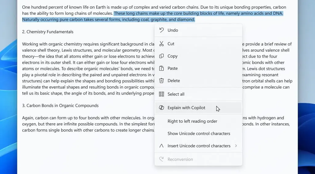 Jeśli zaś chodzi o tytułowy Notatnik, to sprawa prezentuje się jeszcze ciekawiej. Ten podstawowy edytor zyskał opcję o nazwie „Explain with Copilot” umożliwiającą szybkie poradzenie się AI odnośnie do konkretnego fragmentu tekstu czy segmentów kodu. Skorzystanie z nowości jest niezwykle proste.