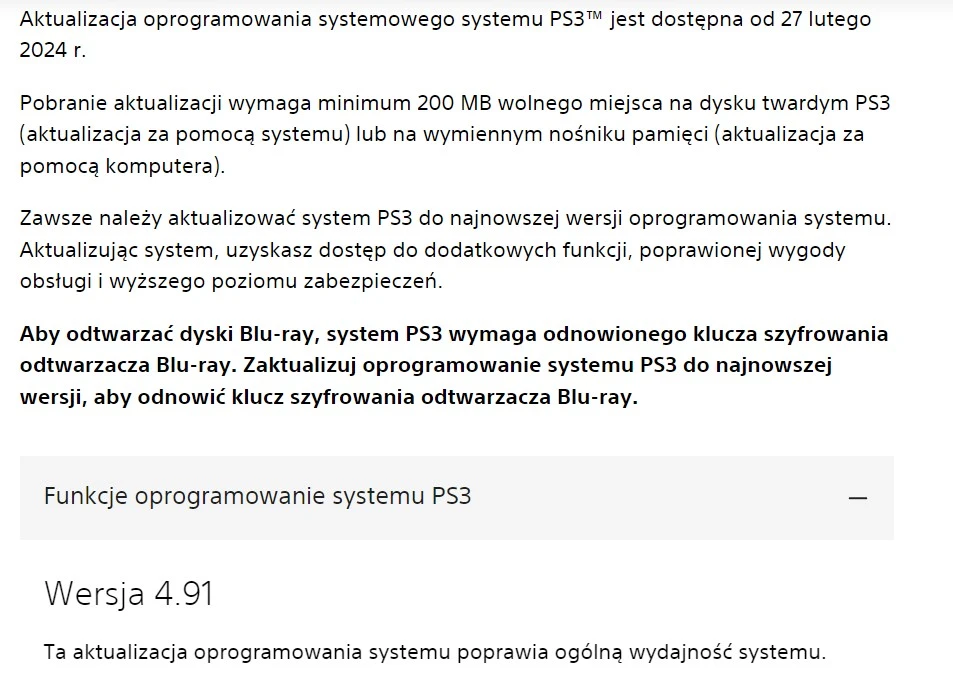 Na oficjalnej stronie wyczytać możemy, że aktualizacja oprogramowania systemowego PS3 jest dostępna od 27 lutego 2024 roku. Tym samym należy przygotować minimum 200 MB wolnego miejsca na dysku twardym lub na wymiennym nośniku pamięci. Na szczęście nie mamy do czynienia z koniecznością pobierania kilku gigabajtów, co pewnie ucieszy część osób posiadających wolne połączenie internetowe.