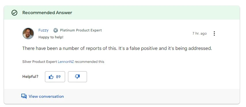 Na forum pomocy technicznej Google w odpowiedzi na wątpliwości internautów napisano, że to przykład tzw. „false positive”, czyli mylnego oznaczenia zagrożenia.