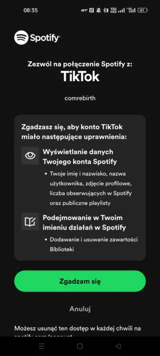 Jeśli korzystacie z rozwiązania po raz pierwszy, to kliknięcie w ikonę aplikacji spowoduje wyświetlenie stosownego monitu. Tam będziecie musieli zezwolić na połączenie obydwu platform. TikTok poprosi o wyrażenie zgody na udostępnienie kilku uprawnień. Mowa przede wszystkim o wyświetlaniu danych konta (imię i nazwisko, nazwa użytkownika, zdjęcie profilowe, liczba obserwujących oraz publiczne playlisty) oraz podejmowaniu działań w imieniu konsumenta (dodawanie i usuwanie zawartości biblioteki).