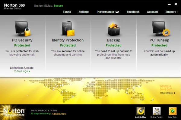 Interfejs użytkownika w nowym Norton 360 porządkuje ustawienia, kontrolki bezpieczeństwa oraz informacje o ochronie komputera i jego wydajności na jednym prostym, zaprojektowanym od nowa ekranie. Tegoroczną nowością jest funkcja Norton Protection Map, która dostarcza aktualne informacje o najnowszych zagrożeniach wykrytych i neutralizowanych przez firmę Symantec. Mapa ta obrazuje fakt, że cyberprzestępczość rozprzestrzenia się w czasie rzeczywistym na całym świecie i przypomina użytkownikom, że muszą dbać o swoje bezpieczeństwo w Internecie. Nowy interfejs użytkownika obejmuje także szybki dostęp do usługi rodzinnego bezpieczeństwa Norton Online Family oraz do systemu Norton Safe Web, ostrzegającego o niebezpiecznych witrynach przed przejściem do nich.