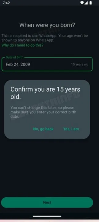 Z najnowszych przecieków wersji beta aplikacji wynika, że WhatsApp zamierza włączyć podawanie roku urodzenia jako obowiązkowy element początkowej jego konfiguracji, oraz potwierdzenie ukończenia 15 lat. Dodatkowo pojawia się ostrzeżenie, że raz podane dane nie będą mogły być zmieniane w przyszłości. Ma to na celu przede wszystkim upewnienie się, że użytkownicy aplikacji spełniają wymagania prawne dotyczące wieku w stanie, w którym mieszkają.