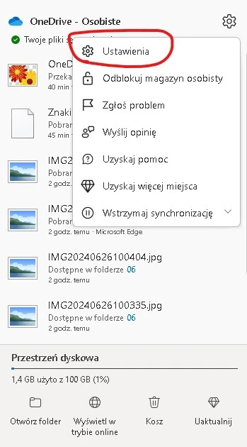 Na szczęście nadal istnieje opcja ręcznego zrezygnowania z automatycznego tworzenia kopii zapasowych. Nie jest to przesadnie trudne, wystarczy wykonać kilka prostych kroków. Pierwszym z nich to kliknięcie prawym przyciskiem myszy na ikonę OneDrive oraz wybranie opcji „Ustawienia”.