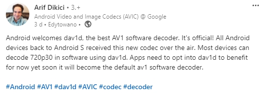 Teraz jednak sytuacja powoli ulega zmianie. Tak przynajmniej możemy wywnioskować z postu opublikowanego przez pracownika korporacji. Arif Dikici to członek zespołu Android Video and Image Codecs, więc dosyć zaufana osoba. Dał on znać, że część smartfonów zacznie używać AV1 znanego też jako „libdav1d” – tym samym wyświetlane na urządzeniach materiały powinny działać po prostu znacznie lepiej. Pojawiają się jednak pewnego rodzaju ograniczenia.