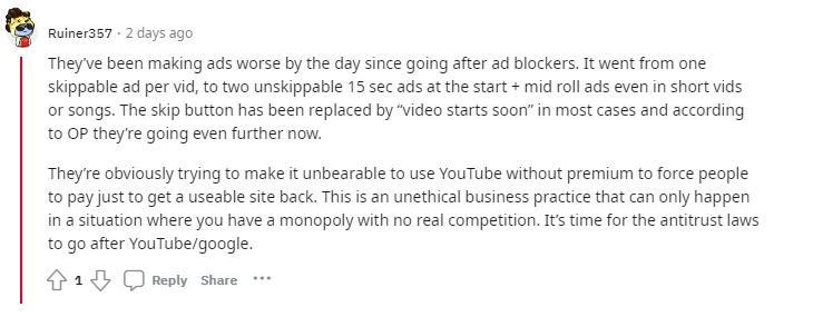 Powyższy zrzut ekranu przedstawia jedno z wielu zgłoszeń tego typu problemu. Użytkownicy dostrzegają przerwy nawet w połowie kilkuminutowego teledysku, których dodatkowo nie da się pominąć. Nie da się ukryć, że mówimy wręcz o agresywnej polityce – część osób na widok tego typu reklam zapewne skusi się na opłatę Premium, zwłaszcza iż YouTube jest obecnie monopolistą na rynku. Próżno szukać konkurencji, nawet odrobinę dorównującej platformie popularnością.