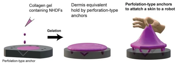 Aby przymocować skórę do powierzchni robota, zintegrowano perforacyjne kotwice w kształcie litery V, które zapewniają zarówno wysoką wytrzymałość, jak i elastyczność. Małe otwory sprawiły, że łatwiej było nałożyć żel kolagenowy, który następnie poddano obróbce plazmowej. Kotwice i głowa robota zostały wyprodukowane za pomocą drukarki 3D AGLISTA-3100 od japońskiej firmy Keyence, wykorzystującej technologię materiału utwardzanego światłem UV, co umożliwia precyzyjne i niezawodne drukowanie.