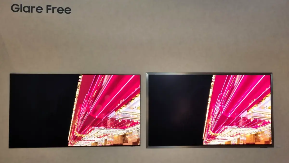 Telewizory OLED, takie jak S99H czy S95H, będą wyposażone w nową powłokę antyrefleksyjną (matowe wykończenie). Miałem okazję chwilę poobserwować, jak sprawdza się ona w warunkach sztucznego oświetlenia. Muszę przyznać, że hotelowe żyrandole, odbijające się na ekranie w nowej generacji Glare Free, były mocno stłumione. Różnica w porównaniu do poprzedniej wersji była wyraźnie widoczna. To zdecydowany plus dla najnowszej wersji Glare Free.