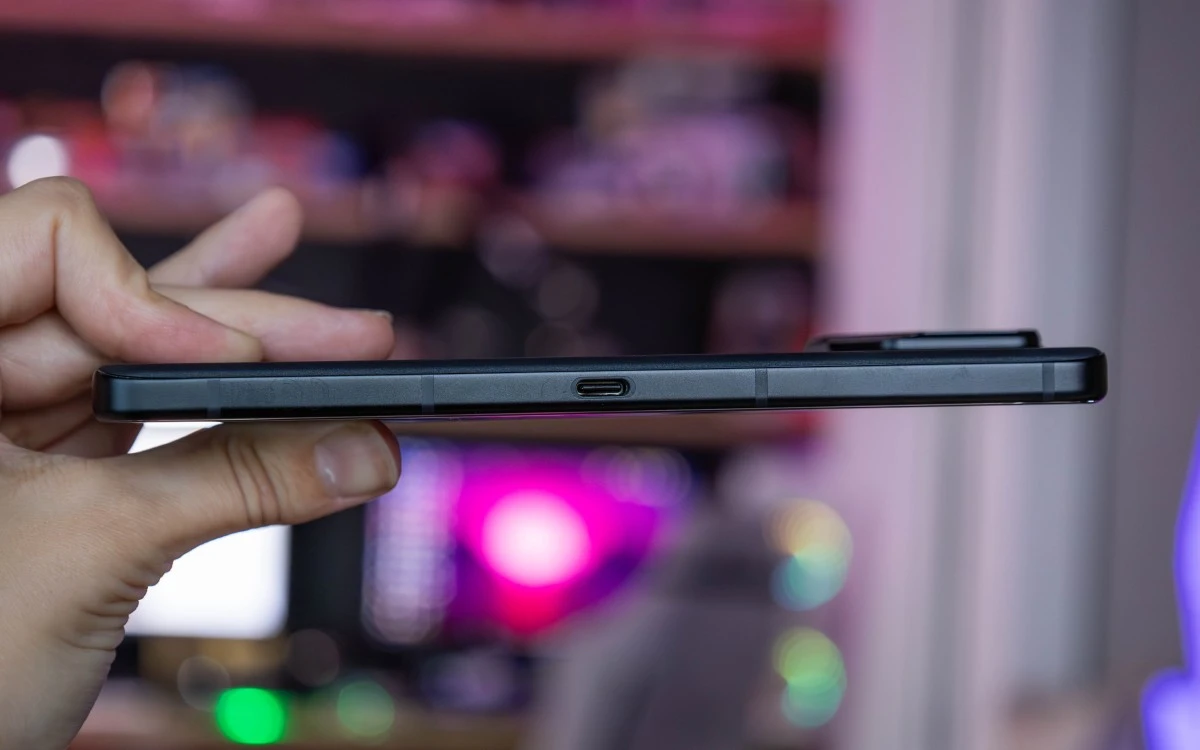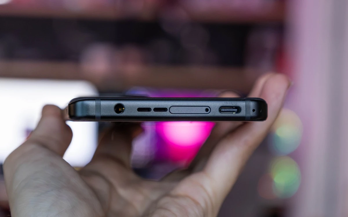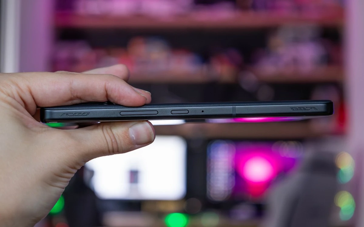 Jeśli chodzi o zawartość ramek, to niektórych z Was ucieszy fakt, że ASUS nie zrezygnował ze złącza jack 3,5 mm. To znajduje się na dolnej ramce, wraz z portem USB-C, tacką na karty SIM i maskownicami mikrofonu oraz jednego z głośników. Ramka prawa zawiera klasyczne przyciski zasilania i do zmiany głośności, ale także dotykowe triggery i najwyraźniej maskownicę kolejnego mikrofonu. Na lewej umieszczono zaś dodatkowy port USB-C, dedykowany zewnętrznemu wentylatorowi. Zestaw audio dopełnią kolejny mikrofon widoczny na górnej ramce oraz głośnik umieszczony między nią a ekranem.