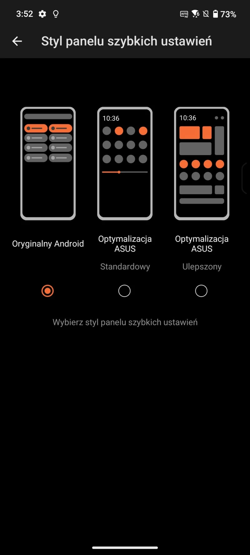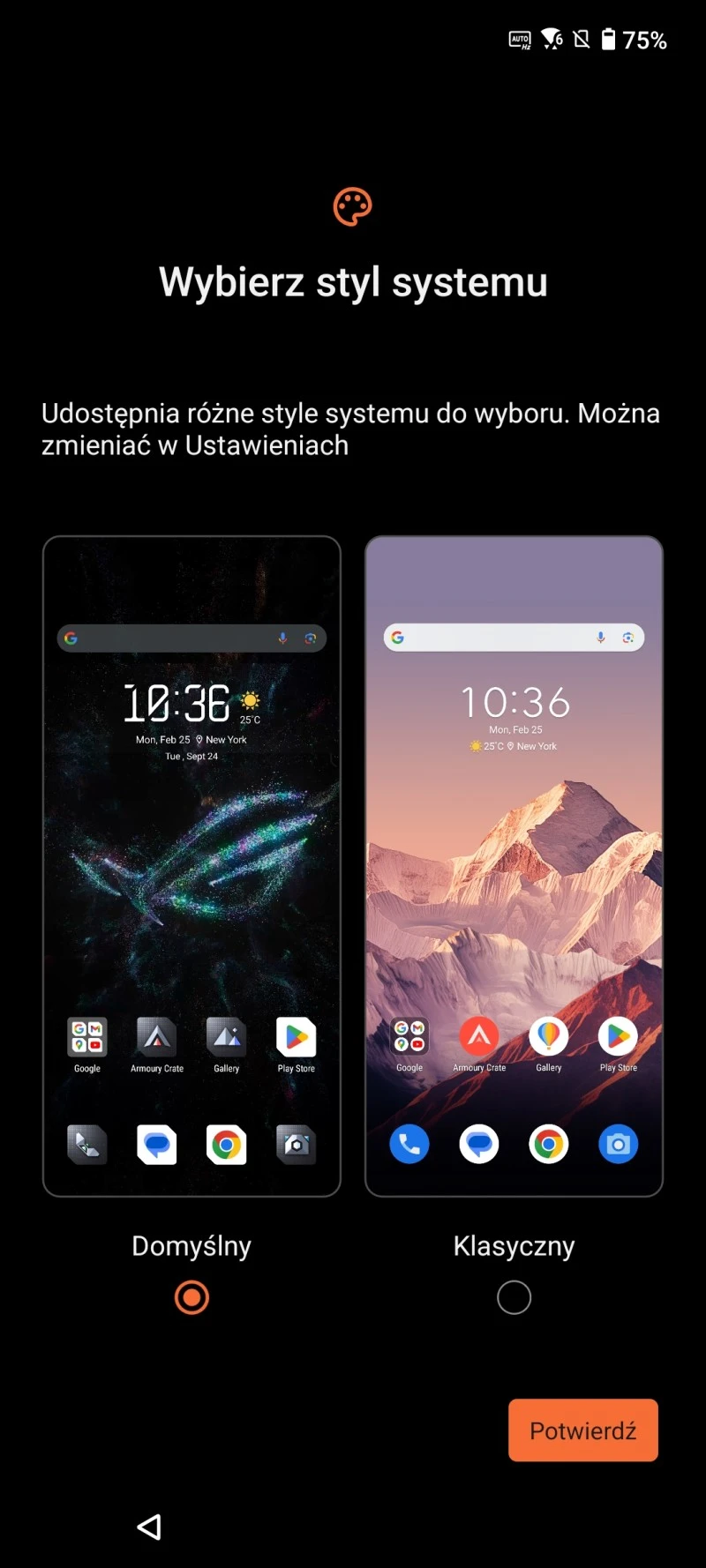 ASUS ROG Phone 9 Pro pracuje pod kontrolą systemu Android 15. ASUS nie ma autorskiej nakładki, natomiast wprowadził w tym systemie pewne modyfikacje i wykraczają one daleko poza dodanie gamingowego motywu ze zmienionym wyglądem ikon aplikacji. Przede wszystkim na start możemy wybrać, czy chcemy korzystać z systemu w domyślnym trybie, czy w trybie z optymalizacjami ASUS, obejmującym wiele więcej kosmetycznych zmian. Dzięki temu możemy zdecydować, jak ma wyglądać menu regulacji głośności, jak mają być wyświetlane połączenia przychodzącej, jak ma wyglądać zegar na ekranie blokady, a także styl panelu szybkich ustawień. Cieszy fakt, że te każdą z tych preferencji możemy wybrać z osobna, i to w dowolnym momencie.