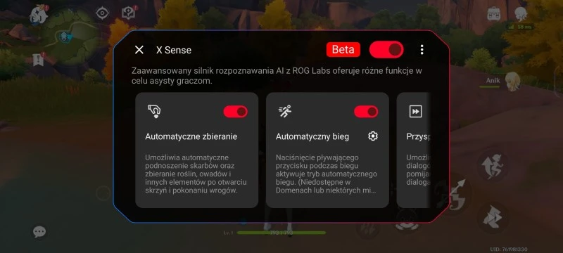 ASUS ROG Phone 9 Pro oferuje też pewne funkcje AI, także te opracowane z myślą o graczach. Na przykład, nakładka Game Genie pozwala włączyć funkcję X Sense, która w niektórych grach oferuje ona graczom dodatkowe możliwości, ułatwiając rozgrywkę. Jedną z tych gier jest Genshin Impact, w których X Sense oferuje automatyczne podnoszenie przedmiotów czy możliwość automatycznego biegu bez konieczności stałego dotykania ekranu.