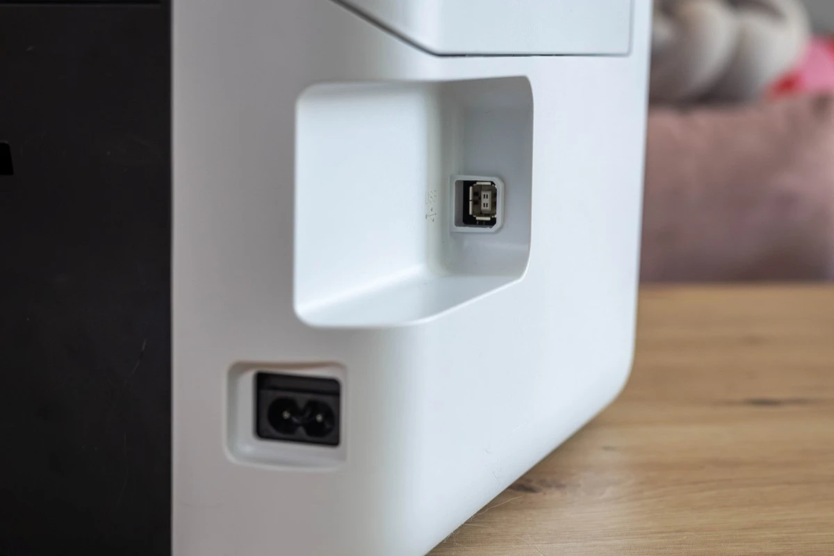 Z tyłu urządzenia znalazł się rzecz jasna podajnik na papier, a jest to podajnik, który mieści 100 arkuszy. Czy to mało? W domowych warunkach nie, a przecież mowa o drukarce dedykowanej do użytku domowego lub w małych, domowych biurach. W tej części urządzenia umieszczono też wszelkie porty, w tym port zasilania.