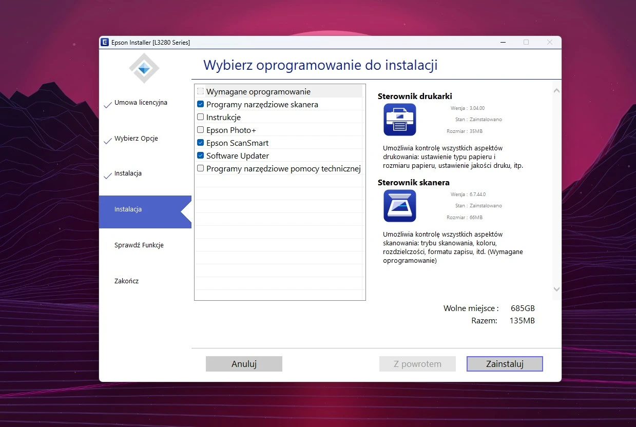 Oczywiście, ważne jest także oprogramowanie, z którym Epson EcoTank L3286 współpracuje na desktopach. Ja urządzenie sparowałam z komputerem z systemem Windows 11, a dokonałam tego, przechodząc do ustawień drukowania i korzystając z opcji „Dodaj urządzenie” (po wcześniejszym połączeniu drukarki z siecią Wi-Fi). Potem pobrałam ze strony producenta program Epson Product Setup, który następnie pobrał odpowiednie sterowniki i pozwolił zainstalować kilka dodatkowych aplikacji, na czele z aplikacją Epson Scan 2 lub Epson ScanSmart do obsługi skanera.