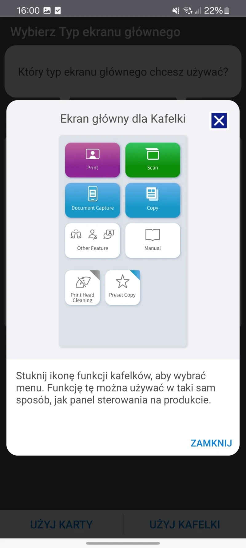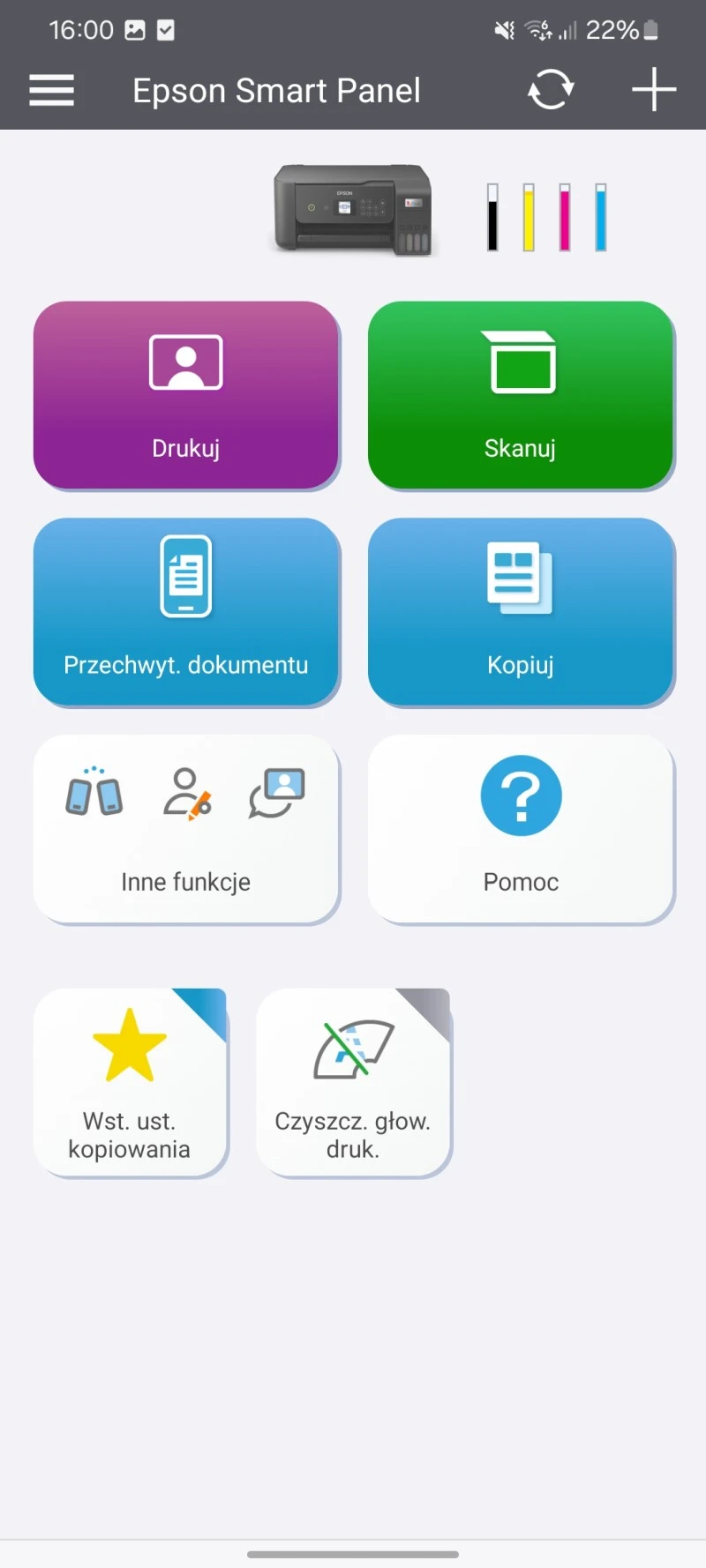 Sama aplikacja Epson Smart Panel jest bardzo prosta w obsłudze i ma intuicyjny interfejs. Z jej poziomu chociażby aktywujemy drukowanie, skanowanie i kopiowanie, włączymy czyszczenie głowicy drukującej, sprawdzimy poziom tuszu, zmienimy ustawienia kopiowania oraz wyświetlimy instrukcję obsługi sprzętu.