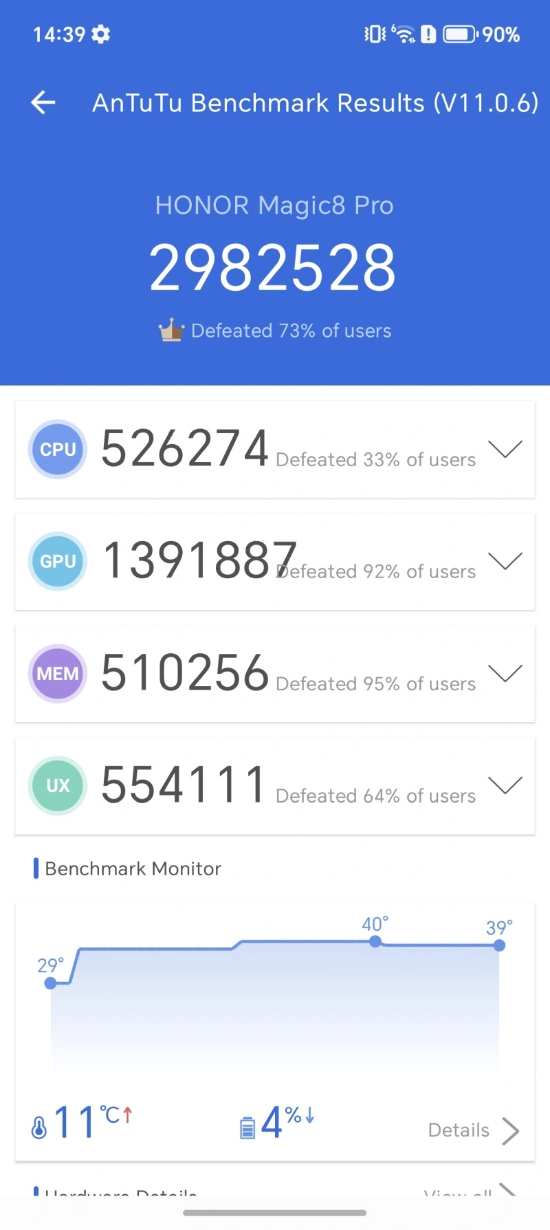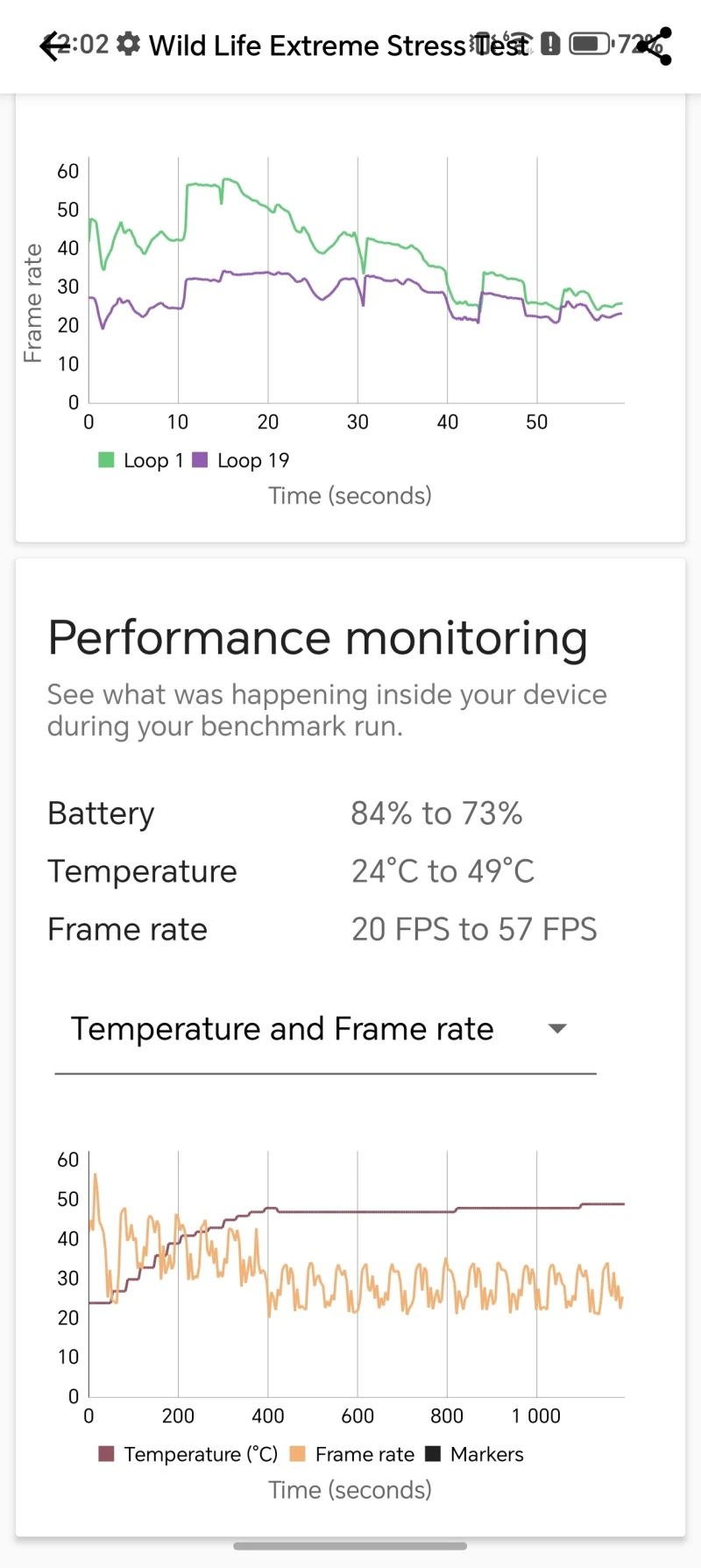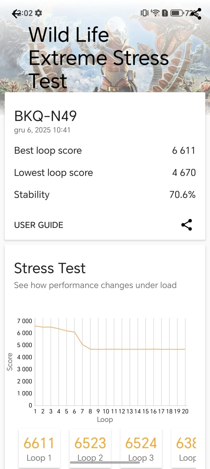 Pod długotrwałym intensywnym obciążeniem HONOR Magic8 Pro doświadcza throttlingu, natomiast jest tak w przypadku wszystkich tak wydajnych smartfonów. Zresztą tutaj throttling nie jest aż tak katastrofalny, bo w jego wypadku smartfon utrzymuje 70% swojej wyjściowej wydajności. Poza tym mowa o wyniku ze stress testu (3D Mark Wild Life Extreme Stress Test), który daje telefonom większy wycisk niż jakakolwiek mobilna gra. Na co dzień o takich spadkach wydajności nie można mówić.