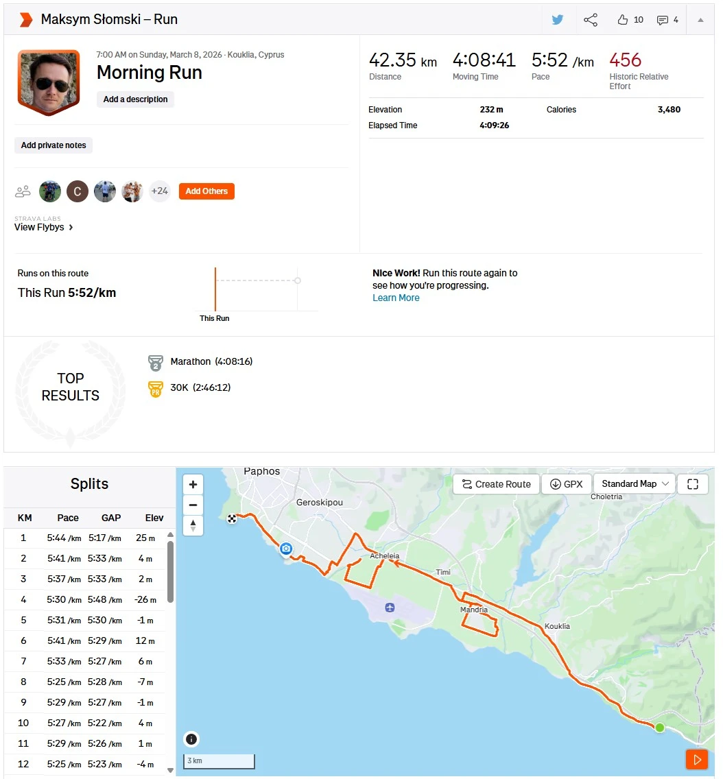 Maraton w Pafos ukończyłem w czasie 4 godzin i 8 minut. Korzystałem z trybu maratonu, a zegarek, na który spoglądałem bardzo często w intensywnym słońcu, rozładował się na dystansie 42,195 km o 16 procent. Producent deklaruje maksymalnie 32 godziny działania w trybie dokładnego śledzenia z włączonym GPS-em, co da się osiągnąć spoglądając na smartwatch rzadziej, gdy jego tarcza nie świeci tak mocno. Realnie, deklarowane 14 dni oszczędnego działania są osiągalne – kilkukilometrowe codzienne wybiegania rozładowują zegarek naprawdę powoli.