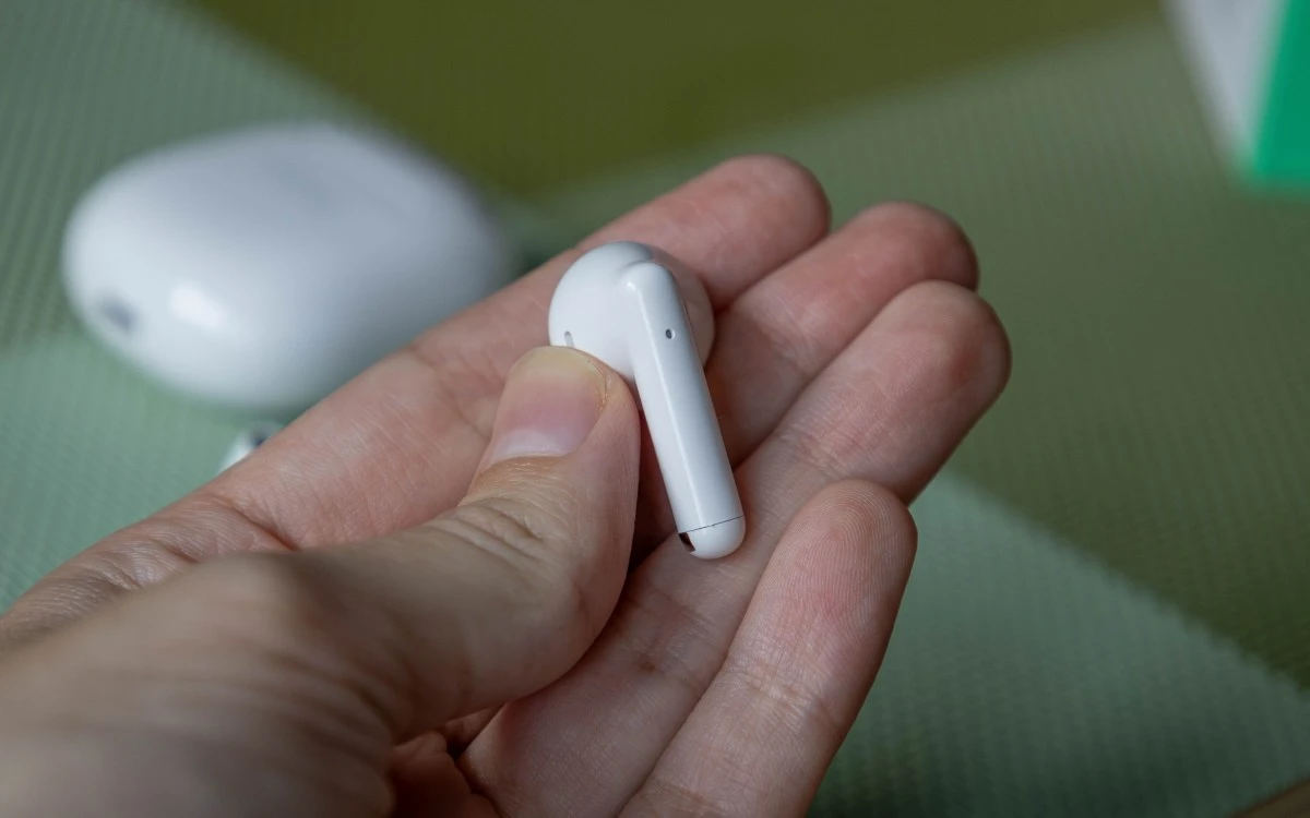 Same słuchawki swoim kształtem nieco przypominają AirPodsy, choć konstrukcyjnie oczywiście dzielą je pewne różnice. Podobnie jak etui, każda ze słuchawek ma diodę stanu. Ma też panel dotykowy obsługujący gesty. Nie posiada natomiast czujnika zbliżeniowego. Innymi słowy, po wyjęciu słuchawki lub słuchawek z uszu odtwarzanie muzyki nie jest wstrzymywane.